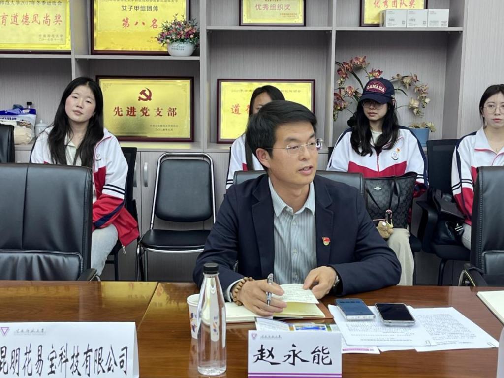 作为合作企业代表,昆明花易宝科技有限公司总经理赵永能介绍了公司发展情况,并分享了自身创业经历,鼓励年轻人在实践中找到自己感兴趣的事业,同时表示将为公司毕业生提供更多实习及就业机会。