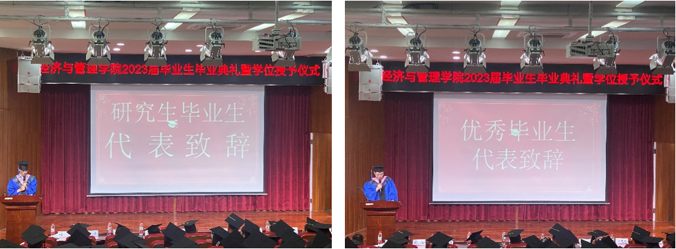 硕士毕业生代表李繁繁同学回忆了自己考学、参加组织活动和做科研的经历,一路走来的辛酸都不能阻挡他继续学习的勇气,一次次的失败最终化成自身前进的动力,长成翱翔的翅膀,一步步飞向远方。优秀毕业生代表陈隆轩告诉我们前进的意义,前进的第一步就是静下心来,专注当下。学术成果需要脚踏实地,专注着一点一滴的学习;前进的第二步是保持热爱,坚持不懈。无论是学术科研,还是步入社会考公考编,只有坚持才能够到达胜利的彼岸。前进的第三步是不忘初心、行胜于言。保持心中的良善,少说多做,用实际行动去验证最终的结果。
