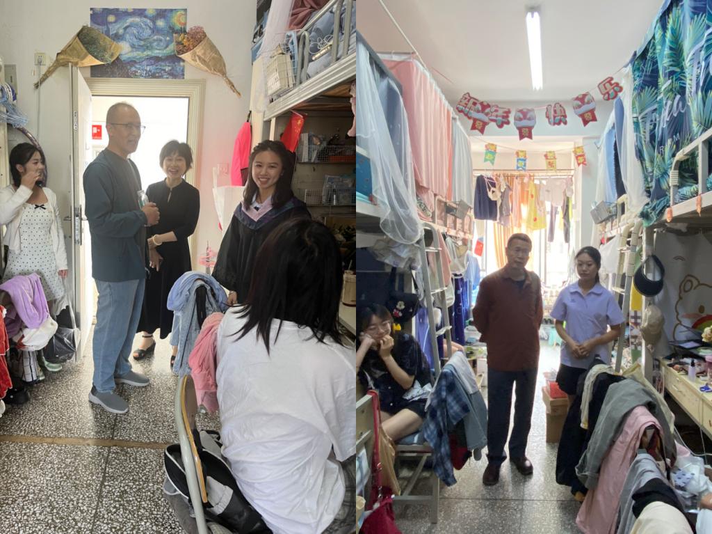 “签了什么工作单位?”“毕业后要回到老家么?”“生活中有没有什么困难?”“离校后有什么样的打算?”……每到一间宿舍,老师们都与毕业生们亲切交流,关切询问同学们的毕业去向、考研情况、就业状况和生活状态,耐心听取同学们现在面临的困难,为正在求职的毕业生提供意见建议,倾听同学们的心声,及时解答问题、疏导困惑并予以鼓励。走访过程中,还叮嘱毕业生们注意求职安全和宿舍卫生安全,做到文明、安全、有序离校。