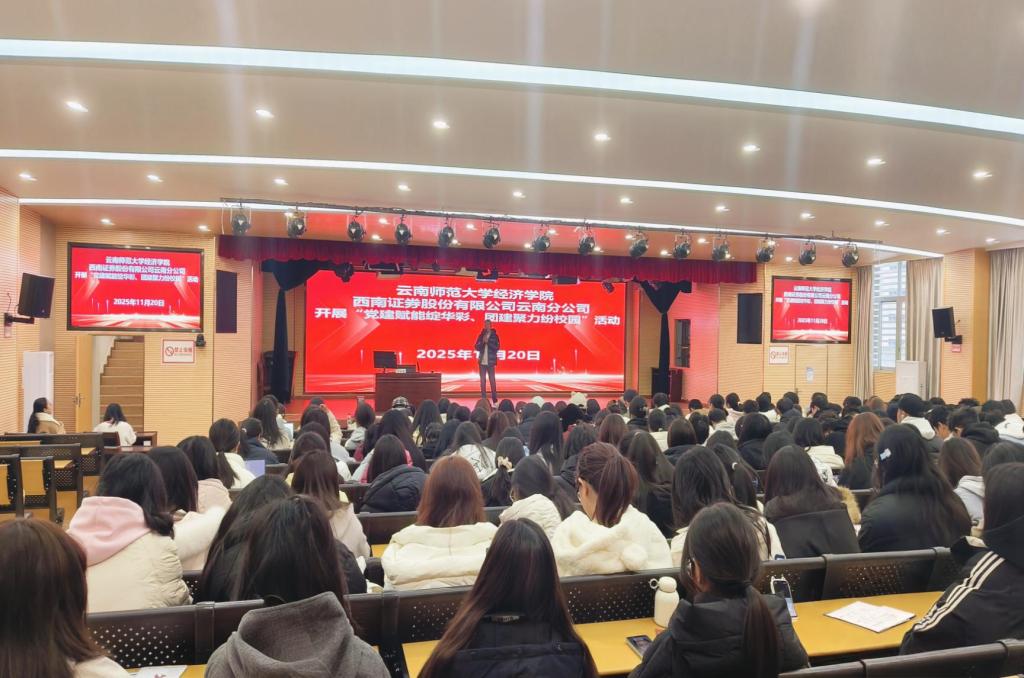 为积极响应金融行业数字化转型与绿色金融发展对高素质人才的需求,深化校企协同育人机制。2025年11月20日下午,公司与西南证券股份有限公司云南分公司在联大校区田家炳书院416报告厅联合举办“党建赋能绽华彩、团建聚力纷校园”主题活动。本次活动以“新时代、新金融、新青年”为主题,通过党建共建引领,汇聚校企力量,共同探索“党建+金融”育人新路径。