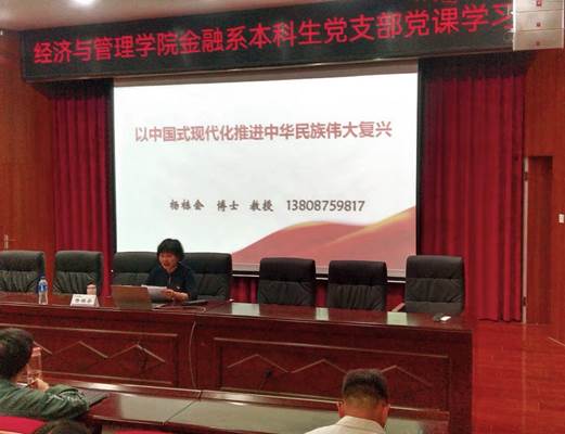 为扎实开展学习贯彻习近平新时代中国特色社会主义思想主题教育,4月26日,经济与管理公司党委书记杨栋会为其联系的金融系本科生党支部讲授《以中国式现代化全面推进中华民族伟大复兴》专题党课,支部七十余名党员和积极分子参加了此次学习。