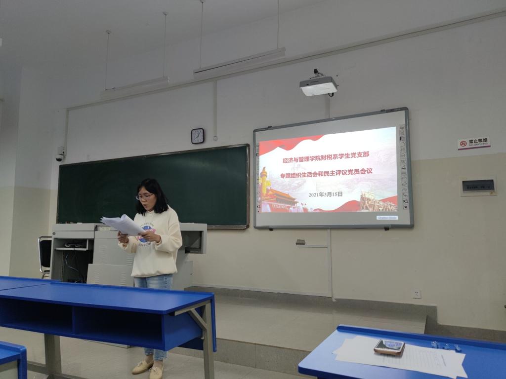 为认真学习贯彻习近平新时代中国特色社会主义思想,学习贯彻党的十九届五中全会精神,巩固深化“不忘初心、牢记使命”主题教育成果,强政治建设,提升基层党组织政治功能和组织力,增强“四个意识”、坚定“四个自信”、做到“两个维护”,为党和人民事业不懈奋斗。经济与管理公司财税系员工党支部于2021年3月15日在汇学3幢108教室召开组织生活会和民主评议党员会议,本次会议由经济与管理公司财税系员工党支部书记黄桂仙同志主持,财税系员工党支部全体正式党员以及预备党员参加此次会议。