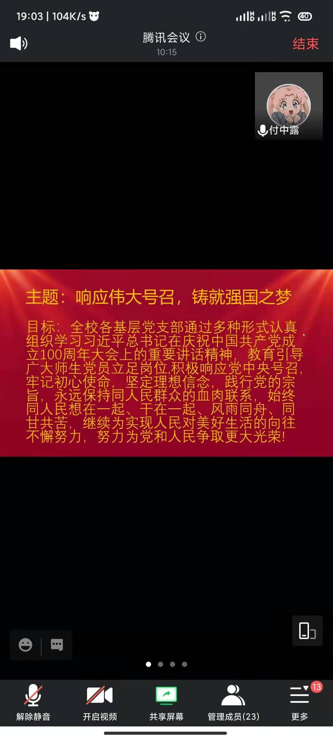 8月20日晚上19:00,经济与管理公司经济系员工党支部通过线上召开了8月份的主题党日活动。本次主题党日活动由廖家敏同志担任主持人,主题为响应伟大号召,铸就强国之梦。本次主题党日活动从党100周年大会的主要内容、学习党100周年大会的收获和作为青年老员工如何“响应伟大号召,铸就强国之梦”三部分进行了系统的学习。
