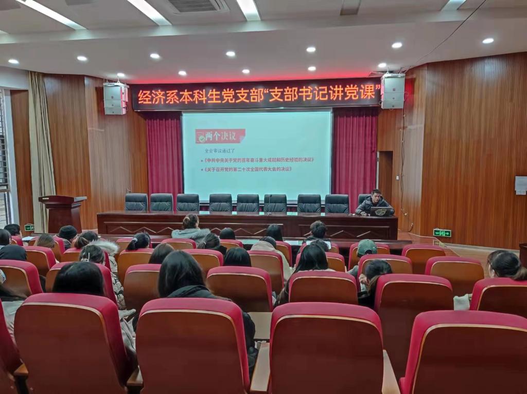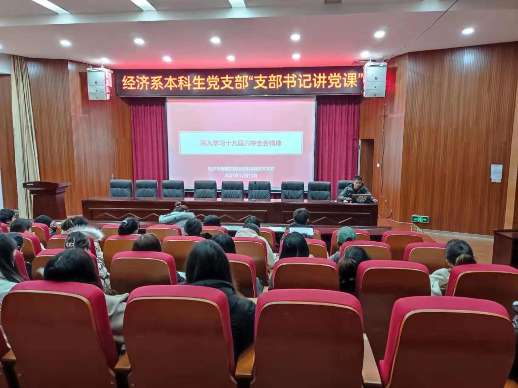 12月13日下午13:00,经济与管理公司经济系党支部在明德1号楼101报告厅组织部党支部召开党员大会,经济与管理公司党支部书记刘安以“学习贯彻党的十九届六中全会精神 新思想引领新征程 新时代展现新作为”为题讲授专题党课,支部全体党员聆听了党课。