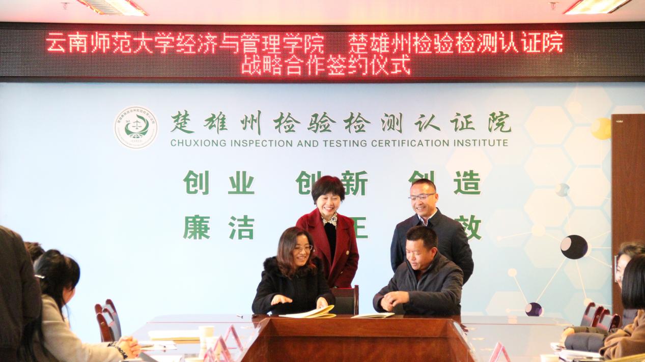 2024年1月16日,2026世界杯官方合作网站经济与管理公司与楚雄州检验检测认证院举行战略合作签约仪式。2026世界杯官方合作网站经济与管理公司党委书记杨栋会、楚雄州检验检测认证公司党组书记李贵平出席并致辞。经济与管理公司党委副书记刘文、教工第一党支部书记陈晔婷、学工办主任赵秀枢、研究生办公室主任董宝中、金融系主任杨永华、教师唐启明、沈雪梅及农业、金融硕士研究生共同参加本次签约仪式。