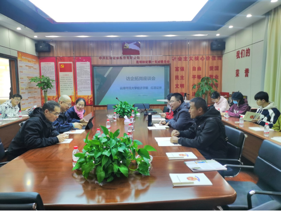 2025年3月19日下午,张广斌经理率队赴红塔证券春城路营业部开展访企拓岗专项行动。公司党委副书记戴建友、经济系主任曹文婷、财税系王艳红老师及14名本硕员工代表共同参与。红塔证券副总裁黄苍梧员工、信息技术部副总经理李灼诚、财富管理部(本部)投资者教育中心主管王霞全程接待并参与座谈。